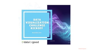 This document announces a visualization challenge hosted by Data for Good to encourage the use of data skills to tell stories with data visualizations. Participants can choose any public dataset to visualize and must submit a single-page PDF by a deadline to be judged on understandability, how well it tells a story, and visual appeal. Bonus points will be given to visualizations that use local Saskatchewan data. Top submissions will be featured on the Data for Good social media and presented at an upcoming meetup. Contact information and examples of visualization tools and public datasets are provided.