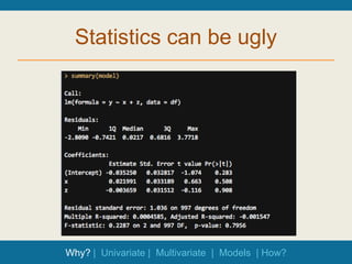 This document discusses data visualization and exploratory data analysis. It provides examples of different types of univariate and bivariate visualizations that can be used to understand data, including boxplots, histograms, scatterplots, grouped plots, mosaic plots, and visualizations of regression models. It also discusses how to create these visualizations using Stata and R.