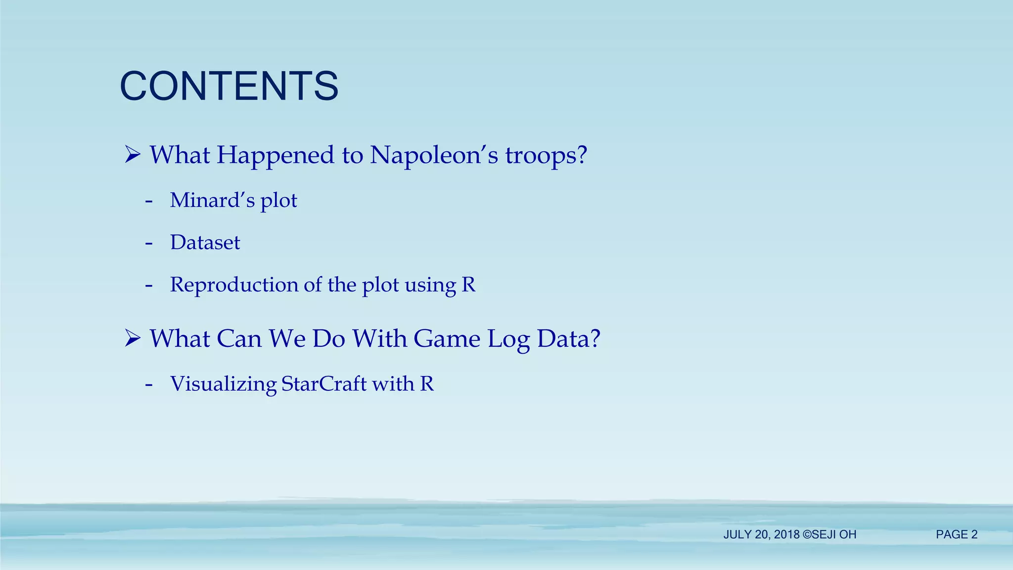 The document discusses data visualization techniques, including Minard's plot of Napoleon’s troops and visualizing game log data from Starcraft using R. It also presents a regression analysis with datasets, detailing simple and multiple regression models, validation techniques, and the use of ggplot2 and tidyverse packages. References to external sources and guides related to the discussed topics are provided.