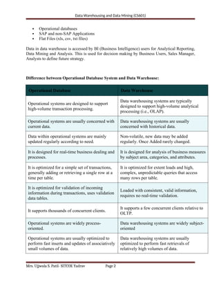 This document provides an in-depth overview of data warehousing and its components, distinguishing it from operational databases. It covers the features, architecture, and ETL (Extract, Transform, Load) process essential for managing and analyzing data from various sources. Additionally, it discusses data modeling and the importance of maintaining historical data for decision-making in businesses.