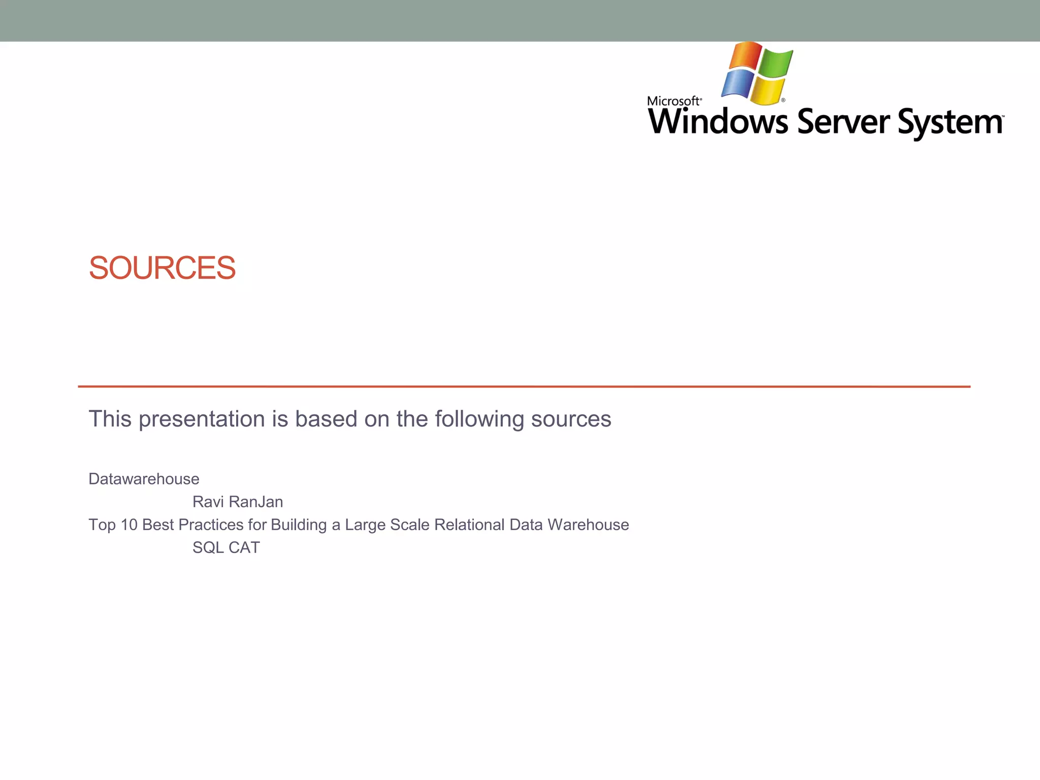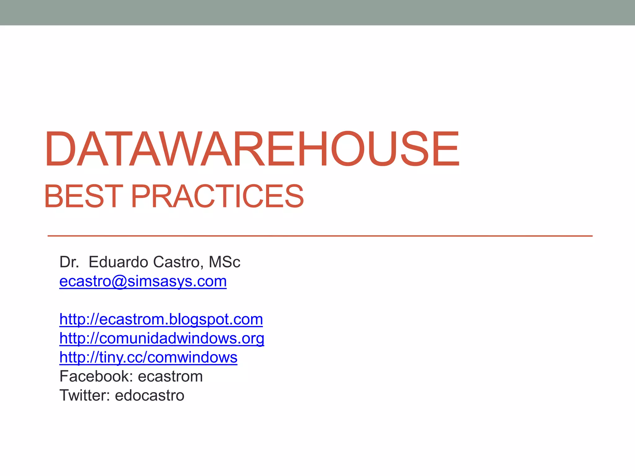 The document outlines best practices for building large scale relational data warehouses, focusing on design techniques, data handling, and maintenance strategies. Key recommendations include partitioning large fact tables, building appropriate indexes, using sliding window techniques, and effectively managing data loading and deletion processes. It emphasizes the importance of training, data integrity checks, and efficient backup strategies to ensure a successful data warehousing project.