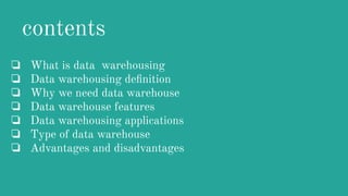 Data warehousing involves collecting data from different sources and organizing it in a way that allows for analysis to make business decisions. It provides a single, complete view of data that end users can easily understand. A data warehouse stores integrated data from multiple sources and provides historical views of data to support analysis. It allows organizations to access critical information to support reporting, queries and decision making. Common applications of data warehousing include banking, healthcare, airlines and telecommunications.