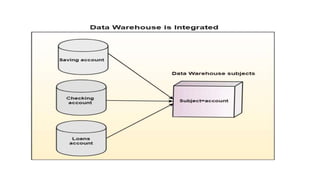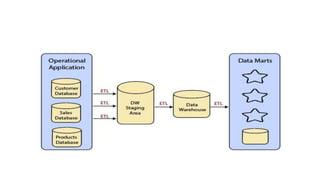 The document provides a comprehensive overview of data mining and warehousing concepts, emphasizing the distinctions between databases and data warehouses, which serve different purposes in managing data. It discusses various data warehouse architectures and modeling techniques, explains the historical development and goals of data warehousing, and outlines the benefits and requirements for businesses. Additionally, it covers the design approaches for creating effective data warehouses, including top-down and bottom-up methodologies.