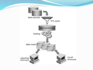 This document provides a project report on data warehousing. It includes an abstract describing data warehousing and how it transforms operational databases into informational warehouses for analysis. It also describes the introduction, background, architecture, advantages, and conclusion of data warehousing. The report is submitted by Sana Alvi and includes references.