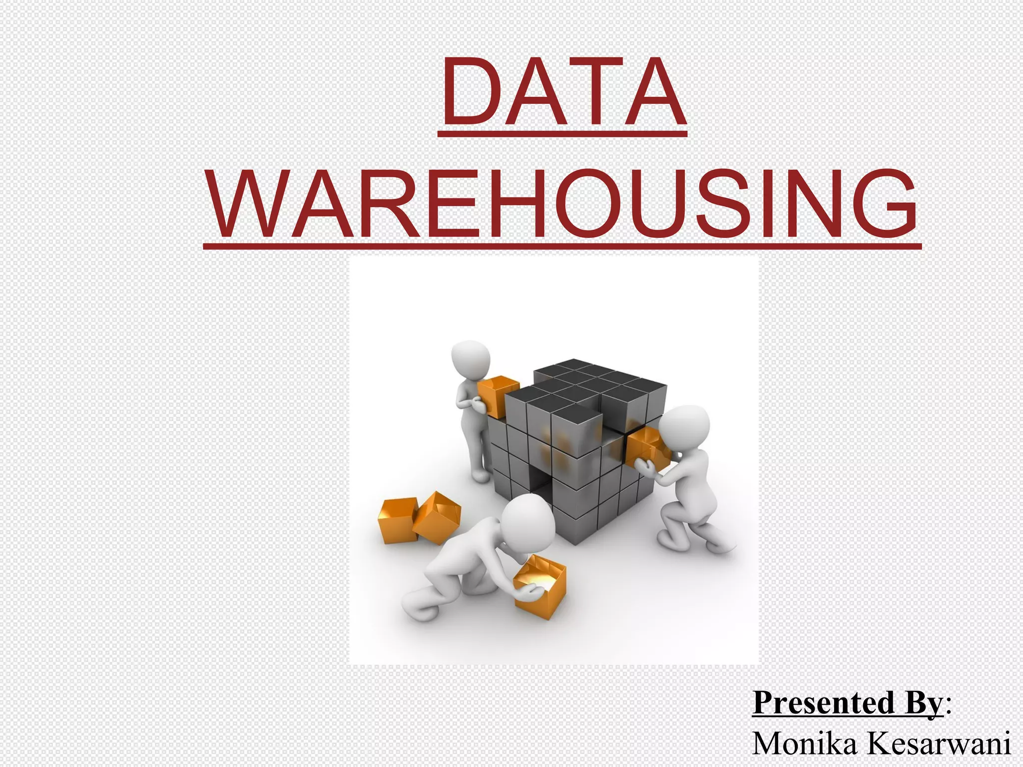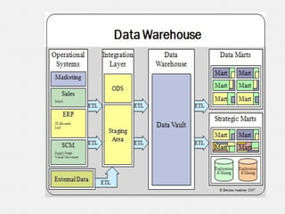 The document provides an overview of data warehousing, defining it as a subject-oriented, integrated, non-volatile, time-variant data collection that supports management decisions. It discusses the architecture and characteristics of data warehouses, compares them with databases, and explains multidimensional schemas, OLAP operations, and the process of building a data warehouse. Additionally, it highlights applications such as query and reporting tools, OLAP, analysis, and data mining, concluding that data warehouses address the need for advanced information analysis beyond operational systems.
