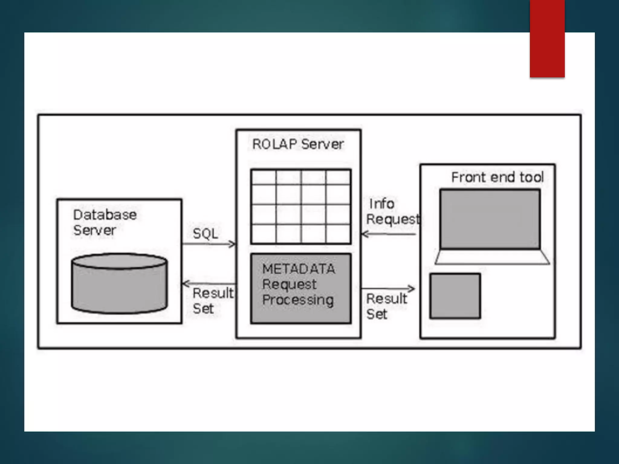 ▪ Relational OLAP servers are placed between relational back-end server