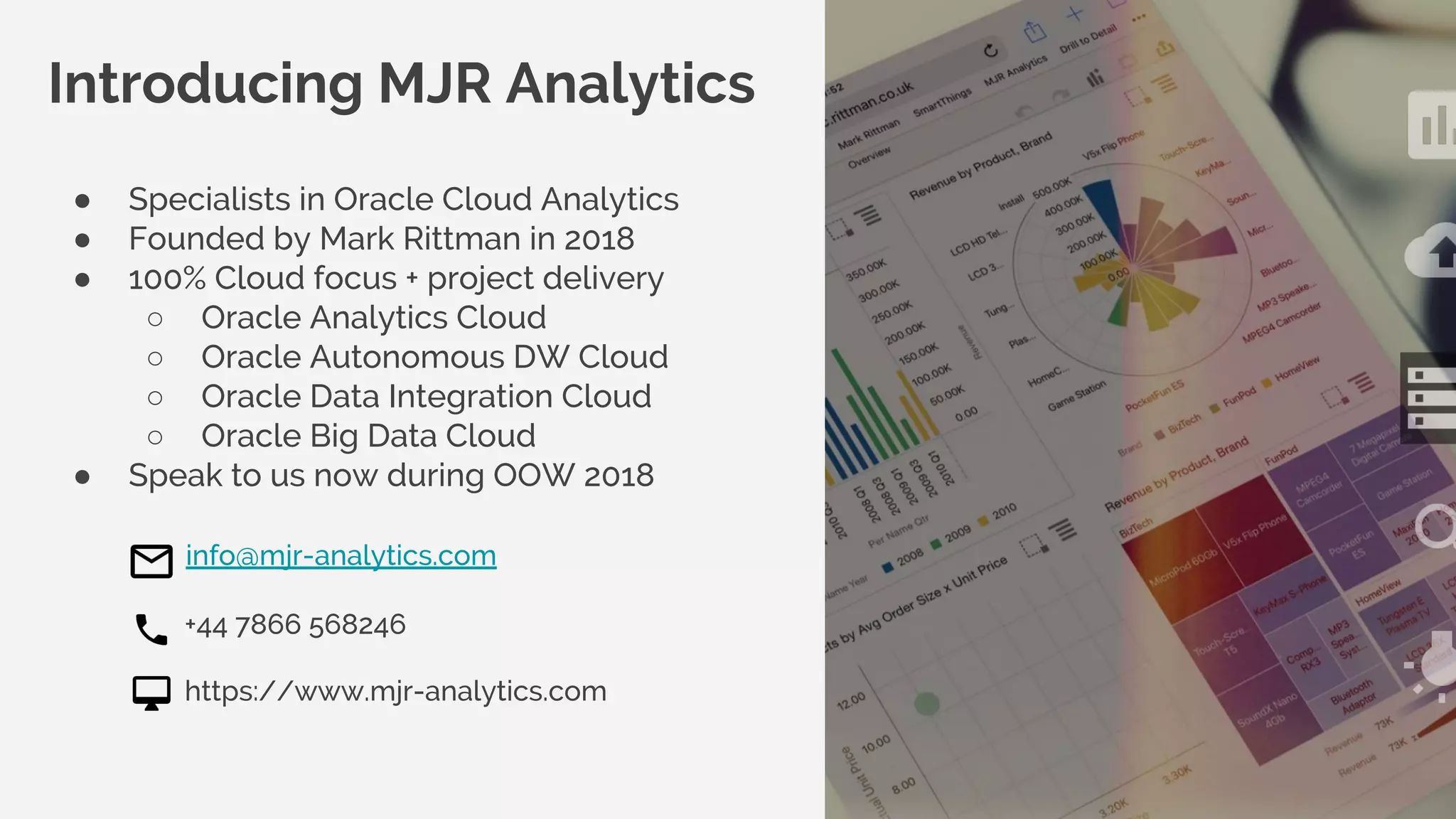 The document outlines the capabilities and features of the Oracle Autonomous Data Warehouse Cloud, which offers a fully-managed data warehousing solution designed for scalability and ease of use. It highlights the platform's automatic provisioning, self-tuning, and simplified data access, along with its integration with various analytics tools. Additionally, the speaker shares their experiences from working at a tech startup, emphasizing the importance of agility and data-centric operations in modern businesses.