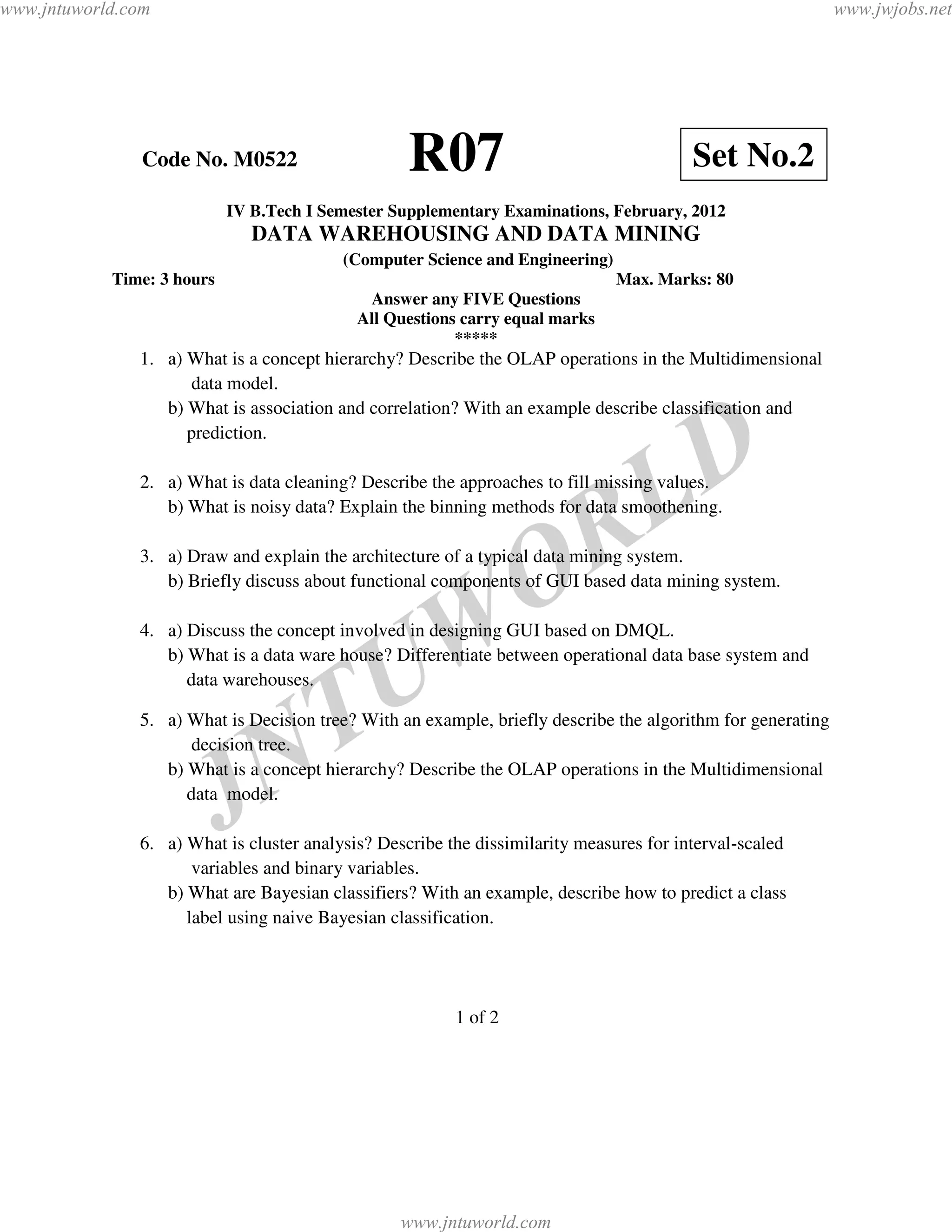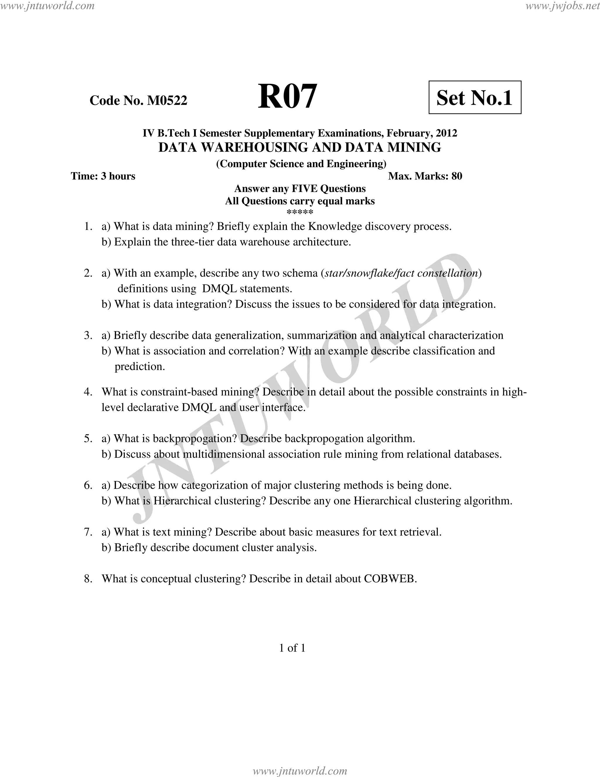 This document contains 8 questions related to the topics of data warehousing and data mining for a supplementary exam. The questions cover various topics such as data mining processes and algorithms, data warehouse architectures, schema definitions, data integration issues, data cleaning techniques, clustering methods, decision trees, association rule mining and more. Students were instructed to answer any 5 of the 8 questions.