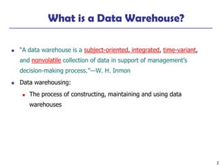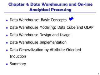 The document provides a comprehensive overview of data warehousing and online analytical processing (OLAP), focusing on the fundamental concepts, models, and processes involved in constructing and utilizing data warehouses. Key topics include the distinction between operational databases and data warehouses, the architecture of data warehouses, and various OLAP operations such as roll-up and slice and dice. It further explores data modeling techniques, data cube definitions, and the necessity of extraction, transformation, and loading (ETL) processes for effective data analysis.