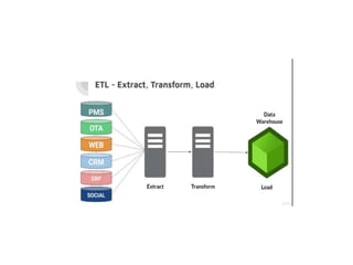 The document discusses data warehousing, data mining, and business intelligence. It defines each topic and explains their key processes and purposes. Data warehousing involves collecting, storing, and managing large amounts of data from different sources for analysis and decision making. Data mining analyzes large datasets to identify patterns and relationships for informed decisions. Business intelligence provides technologies and methods to analyze business data for insights, performance improvement, and informed decision making.