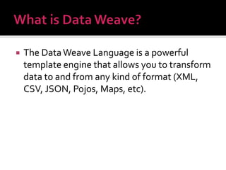 The document summarizes DataWeave, a data transformation language used in MuleSoft. It describes: