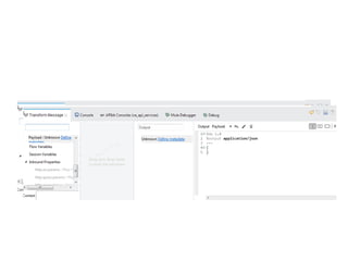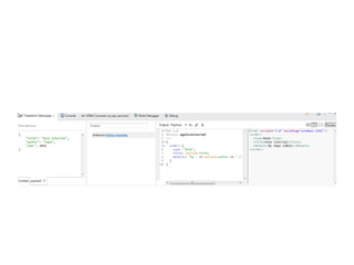 DataWeave is Mule's tool for transforming data between different formats. The Transform Message component uses a DataWeave script to transform the incoming Mule message. DataWeave scripts contain a header section defining directives and an output structure, and a body section describing the transformations using the DataWeave syntax. DataWeave allows mapping between input and output fields visually or by writing code to aggregate, normalize, group, join, partition, pivot and filter data.