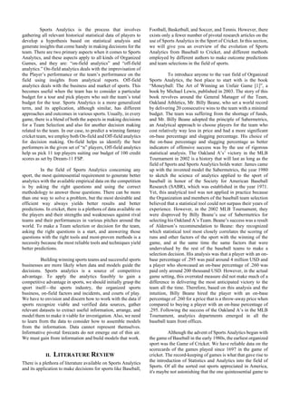 The document describes a data science approach to predict winning fantasy cricket teams on the Dream 11 platform using player performance data and algorithms like greedy and knapsack. It emphasizes the importance of sports analytics, which has evolved from baseball to include various sports, particularly cricket, employing statistical methods to inform team selections and enhance decision-making. The authors built a predictive model that improves the likelihood of success by analyzing player data, utilizing Python libraries for regression analysis and data visualization.