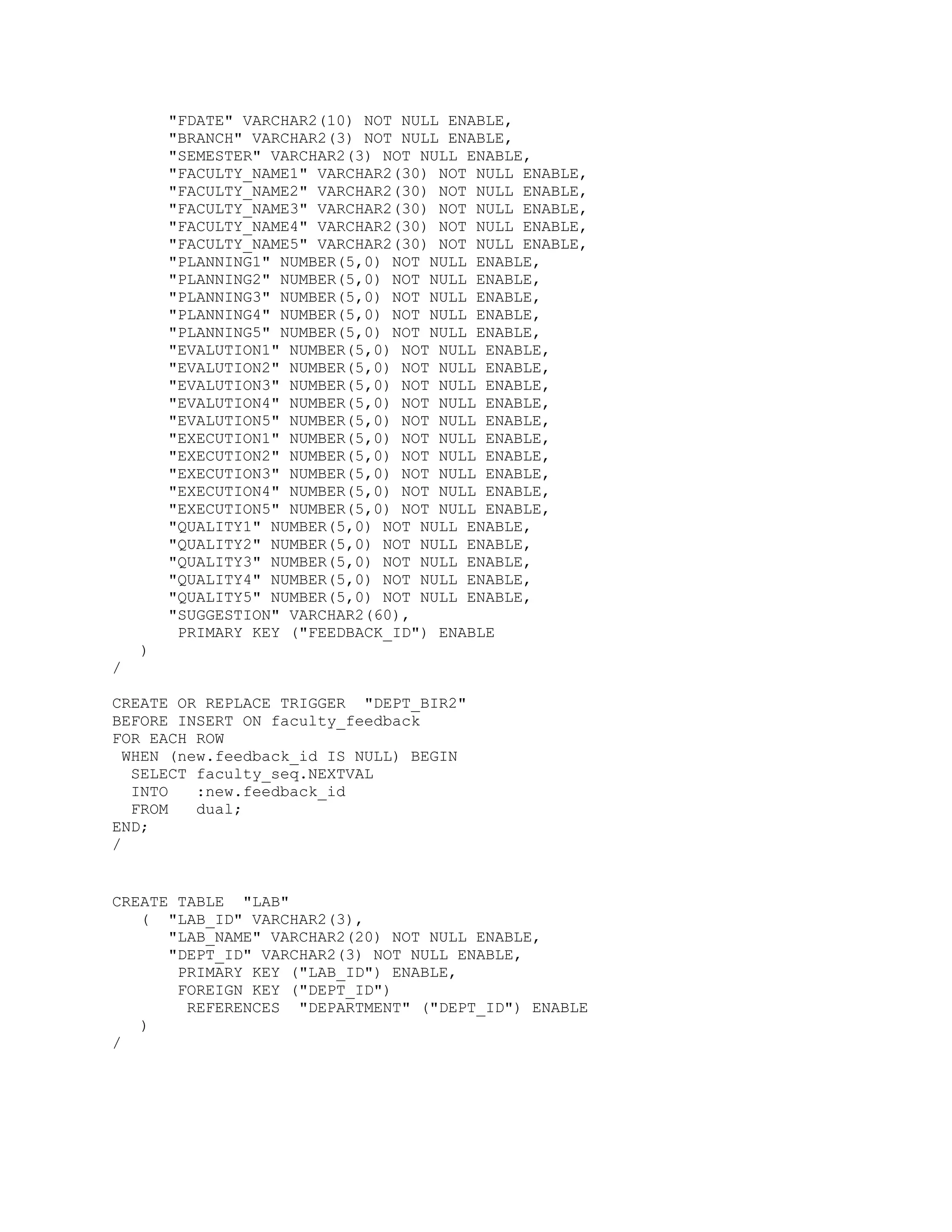 The document contains SQL statements that create 11 database tables: Admin, Branch, Course, Department, Faculty, Faculty_feedback, Lab, Lab_feedback, Library_Feedback, Student, and Subject. The tables define columns with data types and constraints such as primary keys, foreign keys, and unique constraints. Triggers are also created to populate primary key values for some tables upon insert of new records.
