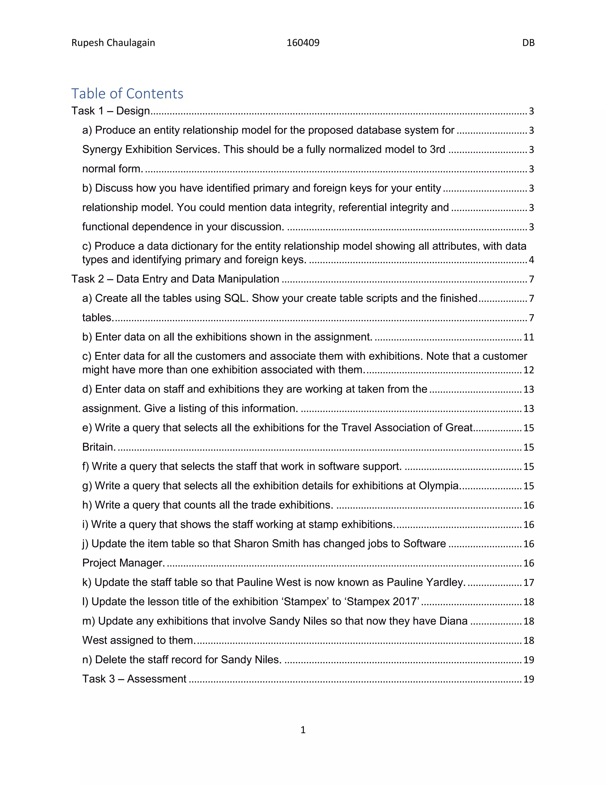 The document discusses designing a database for an exhibition services company. It includes: