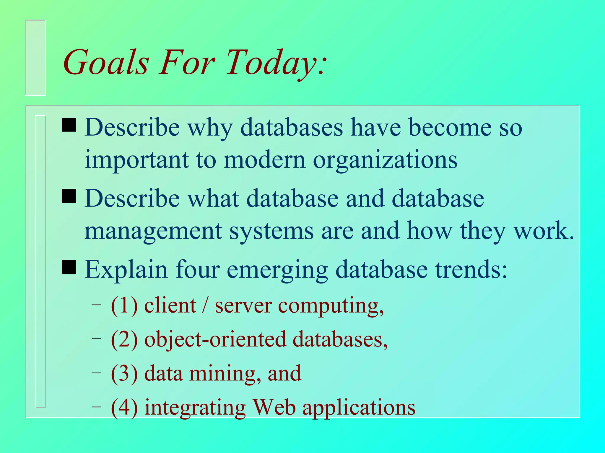 Databases have become important for organizing data in modern organizations. A database contains tables with records and fields to store related data. Database management systems allow users to create, access, and modify this data. Emerging trends include client/server systems that split databases onto servers and client computers, object-oriented databases that treat database components as reusable objects, data mining that analyzes stored data to understand customers and business, and linking web applications to organizational databases.