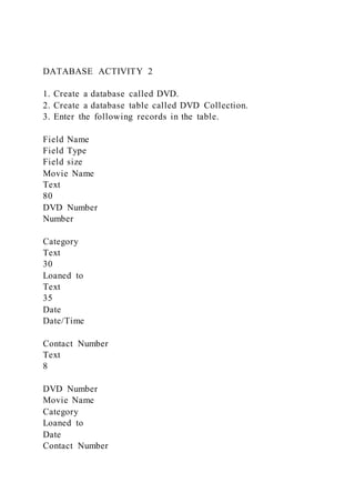 1. A database called DVD was created with a table called DVD Collection to store records of movies in a collection.