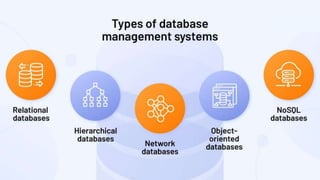 A database management system (DBMS) is middleware that allows users to store, organize, access, and manipulate data in a database. A DBMS consists of a collection of interrelated data and a set of application programs to manage that data. It acts as an intermediary between the database and users or applications. Common DBMS types include hierarchical, relational, graph, and object-oriented relational. Features of DBMS include reducing data redundancy, allowing multi-user access, efficient data storage and retrieval, and high data security. Components include hardware, software, data, procedures, and database access languages like DDL, DML, DCL, and TCL.