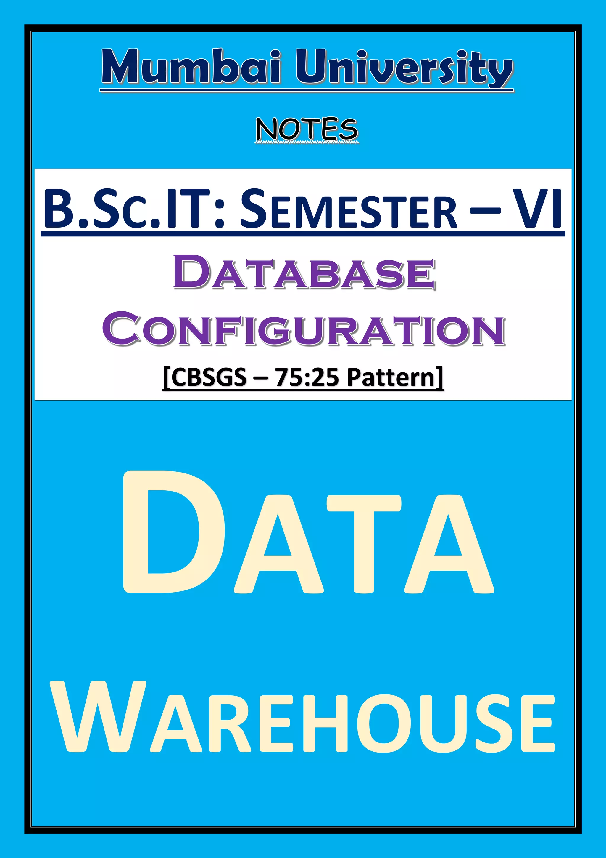 This document discusses the course curriculum for Data Warehousing for the 6th semester of a B.SC. in IT program following the CBSGS 75:25 pattern. The document contains repetitive information about database configuration for the data warehousing course.