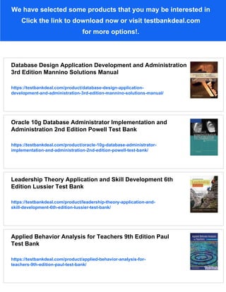 We have selectedsome products that you may be interested in Click the link to download now or visit testbankdeal.com for more options!. Database Design Application Development and Administration 3rd Edition Mannino Solutions Manual https://testbankdeal.com/product/database-design-application- development-and-administration-3rd-edition-mannino-solutions-manual/ Oracle 10g Database Administrator Implementation and Administration 2nd Edition Powell Test Bank https://testbankdeal.com/product/oracle-10g-database-administrator- implementation-and-administration-2nd-edition-powell-test-bank/ Leadership Theory Application and Skill Development 6th Edition Lussier Test Bank https://testbankdeal.com/product/leadership-theory-application-and- skill-development-6th-edition-lussier-test-bank/ Applied Behavior Analysis for Teachers 9th Edition Paul Test Bank https://testbankdeal.com/product/applied-behavior-analysis-for- teachers-9th-edition-paul-test-bank/