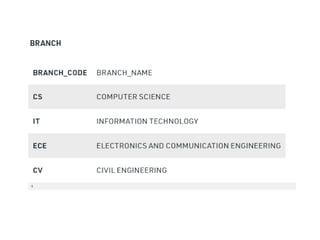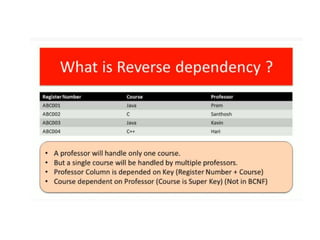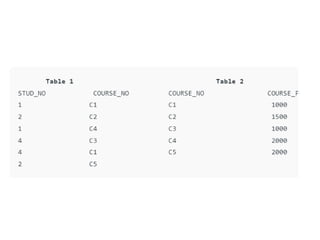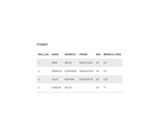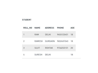 This document provides an overview of relational database concepts including the relational data model, ER diagrams, normalization, and database languages. It discusses how data is organized in tables with attributes, tuples, domains, and keys in the relational model. ER diagrams are used to conceptualize relationships between entities and attributes. Normalization is the process of structuring data to minimize redundancy through various normal forms up to 3NF. Common database languages are also summarized including DDL, DML, DCL, and TCL and their uses.