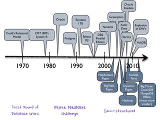 The document provides an overview of database fundamentals, including definitions of databases and Database Management Systems (DBMS), as well as details on various models like the relational model, SQL components (DDL, DML, TCL, DCL), and transaction management. It discusses functions, aggregations, constraints, and advanced topics such as ACID properties, concurrency control, and scaling strategies. Additionally, the document mentions key structures and algorithms used in databases and offers references for further reading.