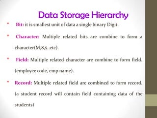 This document discusses the basics of database management systems (DBMS). It begins by explaining the data storage hierarchy from the bit level up to the database level. It then covers different database models including hierarchical, network, relational, and object-oriented. Key components of a DBMS like DDL, DML, query language, and report generators are defined. Commercial DBMS examples are provided. The document concludes with an overview of creating and using a database, including defining the structure, entering data, and searching for information.