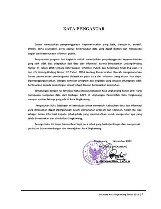 Dokumen ini menyajikan pentingnya keterbukaan data dalam penyelenggaraan pemerintahan yang baik, akuntabel, dan berbasis informasi publik. Dalam konteks tersebut, telah disusun database Kota Singkawang tahun 2011 yang mengumpulkan data dari berbagai sumber untuk mendukung program dan kegiatan pembangunan. Database ini diharapkan dapat digunakan oleh pihak-pihak yang berkepentingan dalam membangun dan memajukan Kota Singkawang.