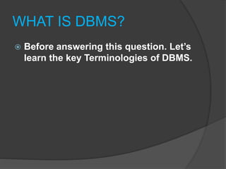 The document defines key terms related to database management systems (DBMS). It states that a DBMS is a collection of programs that allows users to store, retrieve, modify, and update data stored in a database. A DBMS also allows users to create or drop databases. Popular DBMS platforms include Oracle, Sybase, MySQL, and Microsoft SQL Server. The document also defines data, information, databases, database administrators, schemas, primary keys, and foreign keys as important concepts relating to DBMS.