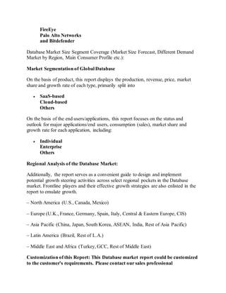 The document provides an in-depth analysis of the global database market, including current and forecasted market size, industry participants, and growth projections up to 2027. It highlights various market segments by type and application, as well as regional insights, while also addressing the impact of COVID-19 on the market. The report is designed for investors, analysts, and businesses looking to understand market dynamics and opportunities in the database sector.