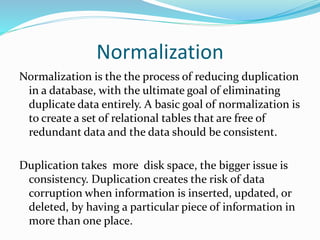Normalization is the process of reducing data duplication in a database. It involves separating relations into multiple tables to eliminate anomalies like insertion, deletion, and modification anomalies. The document describes the process of normalizing a sample "ClientRental" table from an unnormalized form to first, second, and third normal form through removing repeating groups and splitting tables based on functional dependencies between attributes.
