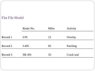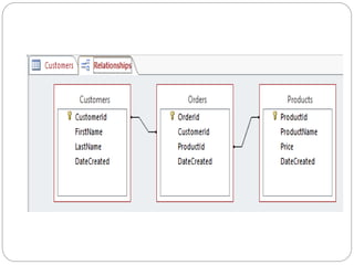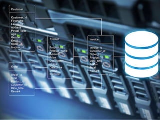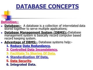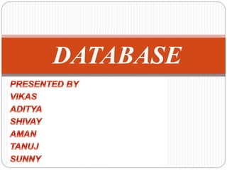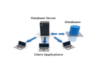 This document provides an overview of databases. It defines a database as an organized collection of data and discusses the main types: flat file, relational, and RDBMS. Key concepts covered include fields, records, tables, relationships, normalization, relational algebra, and SQL. SQL commands like SELECT, INSERT, UPDATE and DELETE are presented. The document also discusses database servers, concepts like primary and foreign keys, and designing reports with headers, footers and details.
