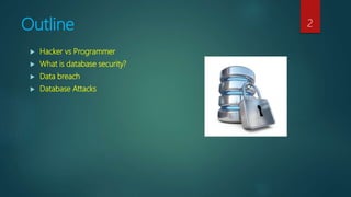 The document discusses database security and common database attacks. It outlines six types of database attacks: excessive privileges that allow inappropriate access to data; privilege abuse where legitimate access is used for unauthorized purposes; platform vulnerabilities that are exploited to gain access; SQL injection that allows sending unauthorized queries; denial of service techniques that compromise availability; and database protocol vulnerabilities. The document emphasizes implementing proper access controls, monitoring, and encryption of backups to mitigate these attacks.