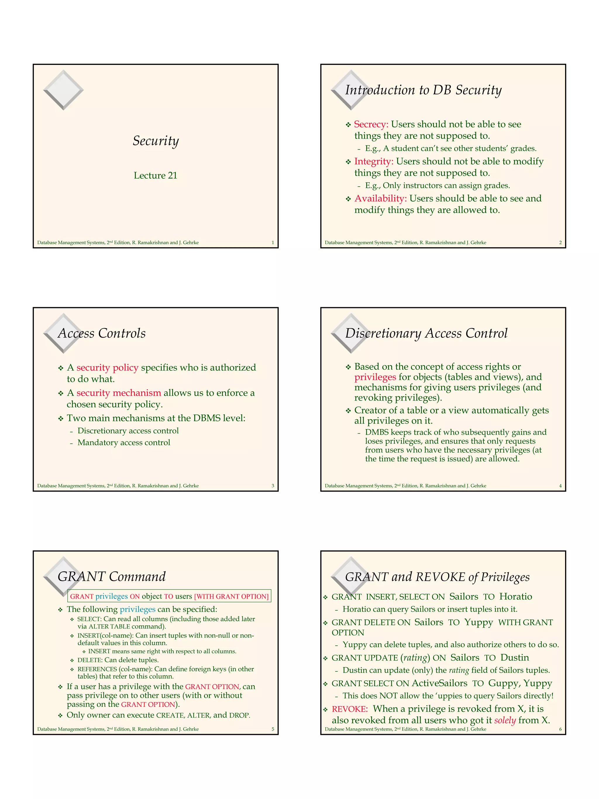 The document discusses database security. It introduces the concepts of secrecy, integrity, and availability as the three main security objectives. It describes two main mechanisms for enforcing security: discretionary access control based on user privileges, and mandatory access control based on security classes. Views and roles can help implement access controls. Statistical databases aim to protect individual data while allowing aggregates, but individual information may still be inferable through queries.
