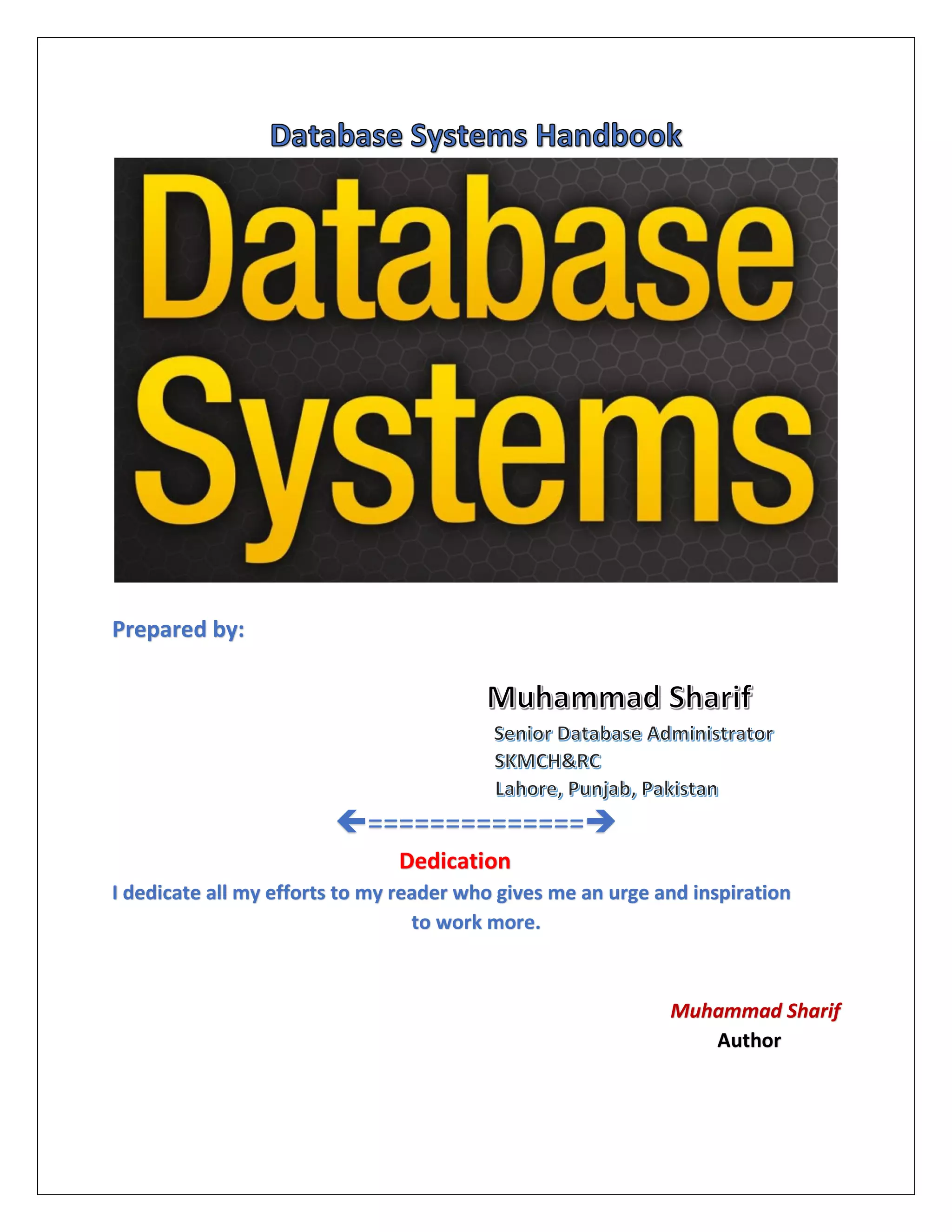The document is a comprehensive handbook on database systems authored by Muhammad Sharif, covering various topics including data types, database management systems, architecture, and types of databases. It details the evolution of databases, from file-based systems to modern distributed and autonomous databases, outlining key concepts and terms such as metadata, DBMS, and data models. Additionally, it provides insights into database design, security, user access, and practical implementation using SQL and other technologies.