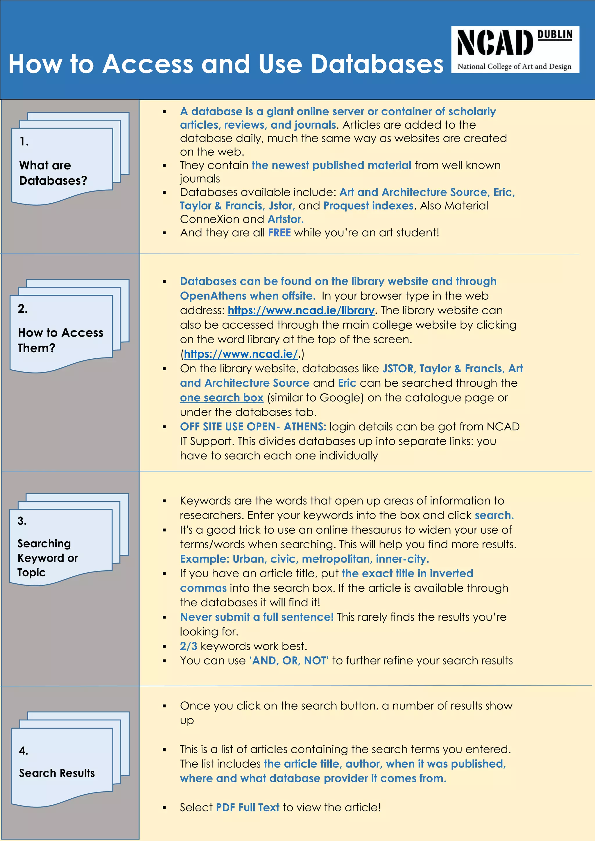 2. They can be accessed through the library website or off-site using OpenAthens login credentials from NCAD IT Support.