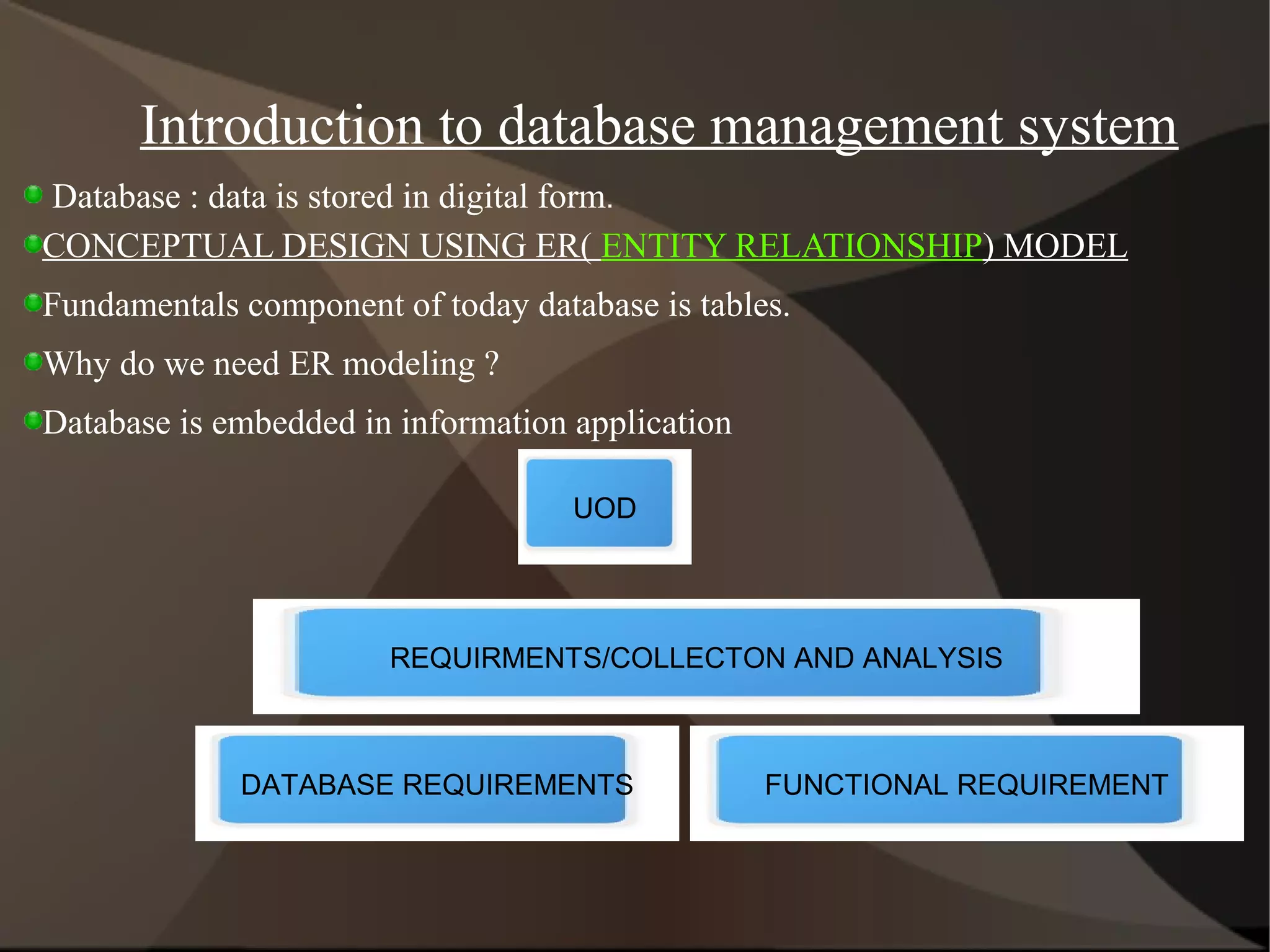 The document introduces database management systems and conceptual database design using the Entity Relationship model. It discusses key concepts such as the universe of discourse, requirements analysis, conceptual schema, entity types, attributes, relationships and constraints. The conceptual schema provides a high-level design of the database that is independent of specific DBMS implementations and easy for non-technical users to understand. This conceptual design forms the basis for later logical and physical database design steps.
