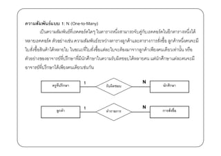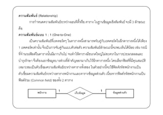 ฐานข้ อมูลเป็ นที)รวมของแฟ้ มข้ อมูลที)ใช้ ในหน่วยงาน เช่น ฐานข้ อมูลของนักเรียนใน โรงเรียนประกอบด้ วย แฟ้ มข้ อมูลประวัตินักเรียน แฟ้ มข้ อมูลรายวิชา และผลการเรียน แฟ้ มข้ อมูลการชําระเงิน แฟ้ มข้ อมูลประวัติสขภาพ แฟ้ มบันทึกความประพฤติของนักเรียน ุ เป็ นต้ น ซึ)งแฟ้ มเหล่านี0จะต้ องมีโครงสร้ างที)สมพันธ์กนเพื)อง่ายต่อการนํามาใช้ เช่น ั ั ความสัมพันธ์ของแฟ้ มประวัตินักเรียน กับ แฟ้ มผลการเรียนโดยมีเลขประจําตัวเป็ น ตัวอ้ างอิง เรียกว่าความสัมพันธ์แบบหนึ)งต่อหนึ)ง (One-to-One) ความสัมพันธ์แบบหนึ)งต่อกลุ่ม (One-to-many)เช่น แฟ้ มทะเบียนนักเรียนสัมพันธ์กบ ั แฟ้ มผลการเรียน แฟ้ มบันทึกความประพฤติ และแฟ้ มการชําระเงิน ความสัมพันธ์แบบกลุ่มต่อกลุ่ม (many-to-many) เช่น แฟ้ มการสั)งซื0อสินค้ าหลายๆ ชนิดที)บันทึกในแฟ้ มสั)งซื0อสินค้ าจากลูกค้ าหลายคน