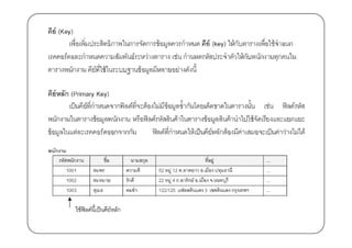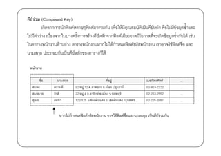 อมูล(File) = หลายตาราง(Table) 1 ตาราง(Table) = มีหลายคอลัมน์(column) หรือสดมภ์ 1 คอลัมน์หรืสดมภ์(column) = 1เขตข้ อมูล(Field) 1 แถวของตารางเป็ นระเบียนข้ อมูลหนึ)งระเบียน(Record) เรียกตามภาษาเฉพาะของระบบฐานข้อมูลคือ Table เรียกว่า รีเลชัน(Relation) Column เรียกว่า แอททริบวท์(Attributes) ิ Record เรียกว่า ทัพเพิลTuple