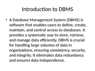 A Database Management System (DBMS) is a software system designed to store, organize, retrieve, and manage data in a structured way. Instead of handling raw files, DBMS provides a systematic and efficient method of managing large amounts of data. It acts as an interface between the database and the end users or application programs, ensuring that data is always organized, secure, and easily accessible.