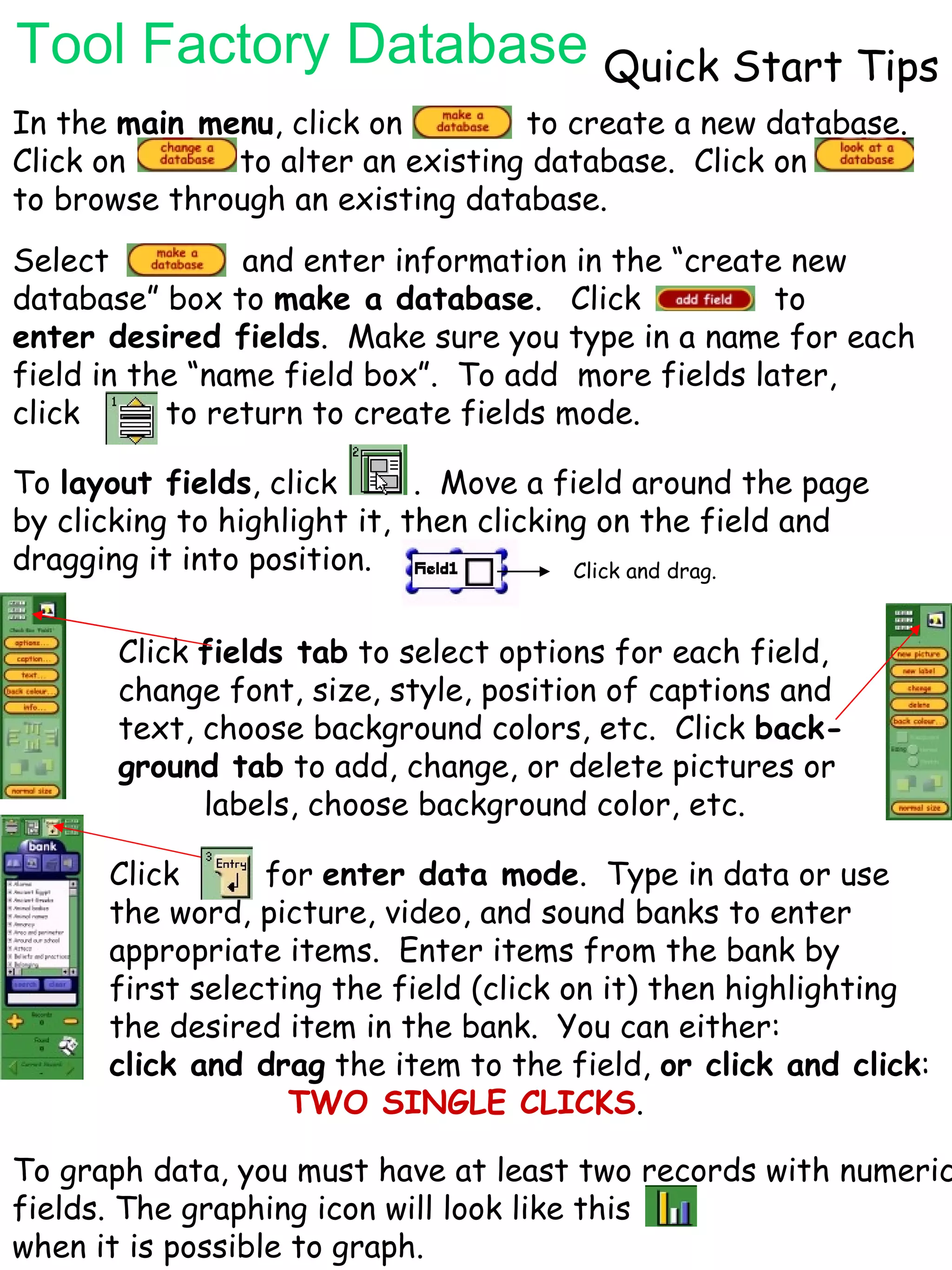 The document provides quick start tips for using a tool factory database. It explains how to create a new database, alter an existing one, and browse databases from the main menu. It describes how to make a database by selecting create new database and entering information. Fields can be added and customized by clicking buttons to enter field information, layout fields on the page, select field options, and add a background. Data is entered by selecting fields and highlighting items from banks to drag or double click into the fields. Graphing requires at least two records with numeric fields.