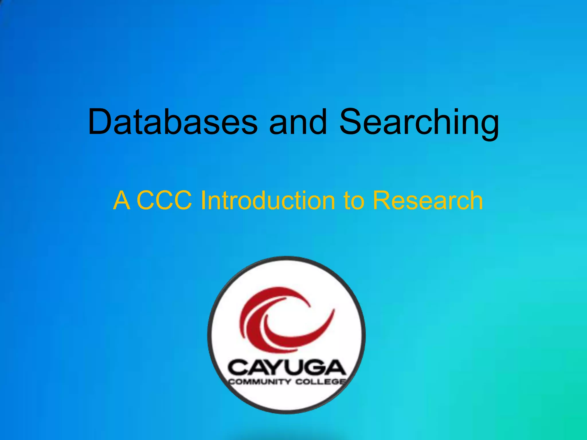 This document provides an introduction to databases and searching for research. It defines what a database is and provides examples such as telephone books, address books, and library catalogs. It explains how databases differ from websites in that databases contain organized collections of related information that can be searched systematically. The document offers tips for constructing effective search terms and describes Boolean search operators like AND, OR, and NEAR that can be used to broaden or narrow search results. It emphasizes practicing different search techniques and using multiple databases to improve research skills.