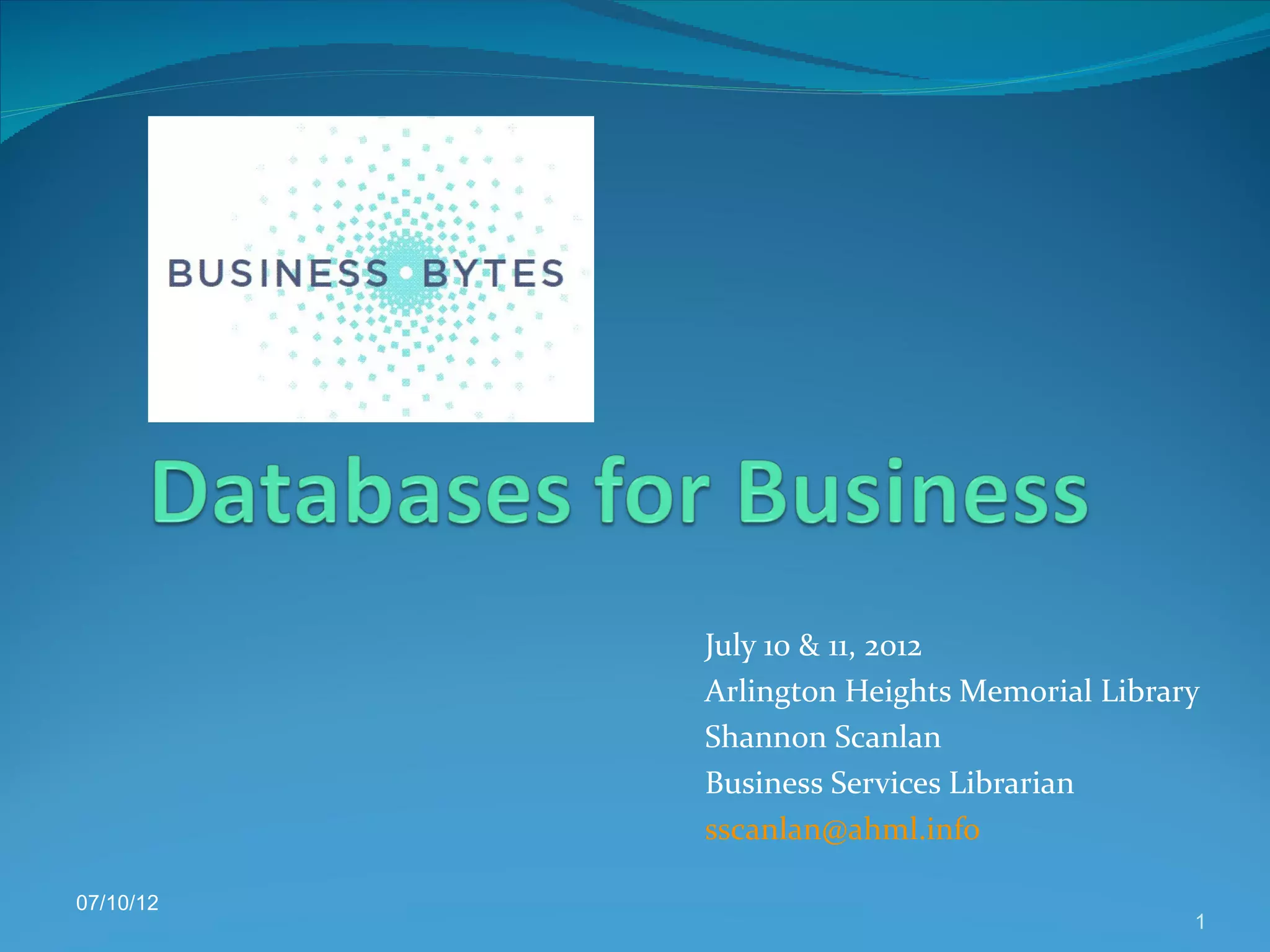 The document discusses business resources available through the Arlington Heights Memorial Library, including databases that can help with researching companies, finding new businesses and competitors, and creating targeted mailing lists. It provides details on databases such as Business Source Premier, Corporate Affiliations, Lexis Nexis Library Express, Plunkett Research, Public Records, and ReferenceUSA that contain company and industry information, profiles, and market research reports. The Business Services Librarian, Shannon Scanlan, encourages using these resources and setting up an appointment for assistance.