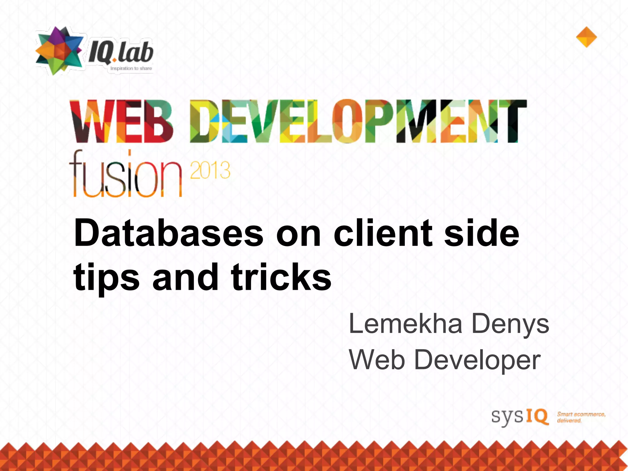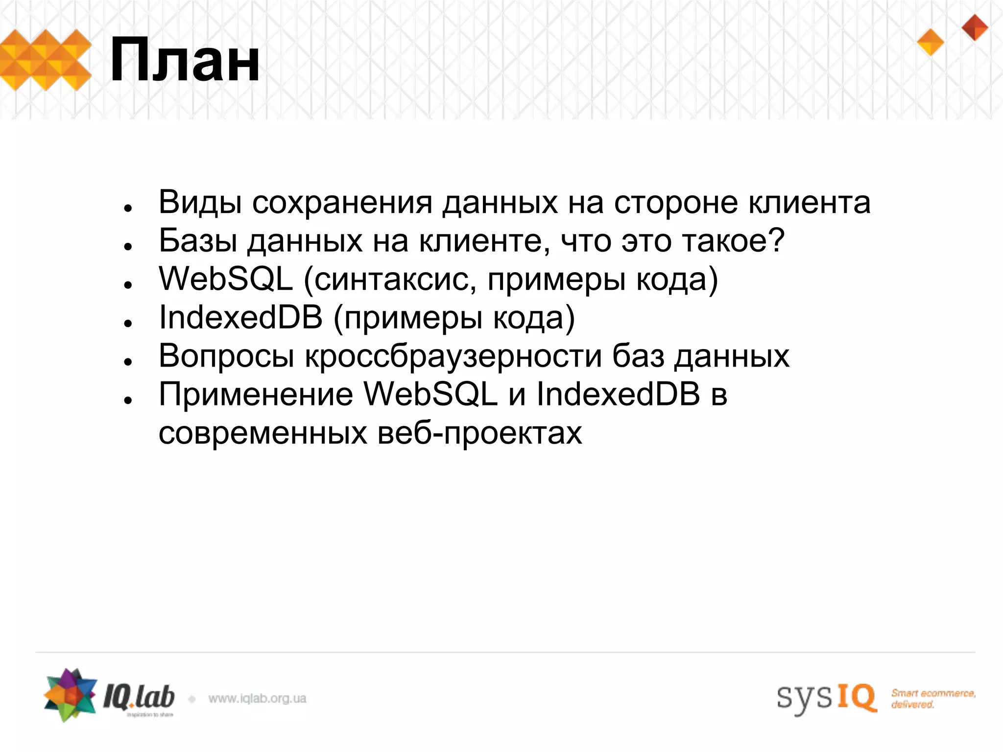 Документ обсуждает различные способы хранения данных на стороне клиента, включая WebSQL и IndexedDB, с примерами кода и синтаксиса. Указываются преимущества и недостатки каждого подхода, а также вопросы кроссбраузерности и поддержка функционала. Обсуждается применение этих технологий в современных веб-проектах, акцентируя внимание на их скорости и транзакционности.