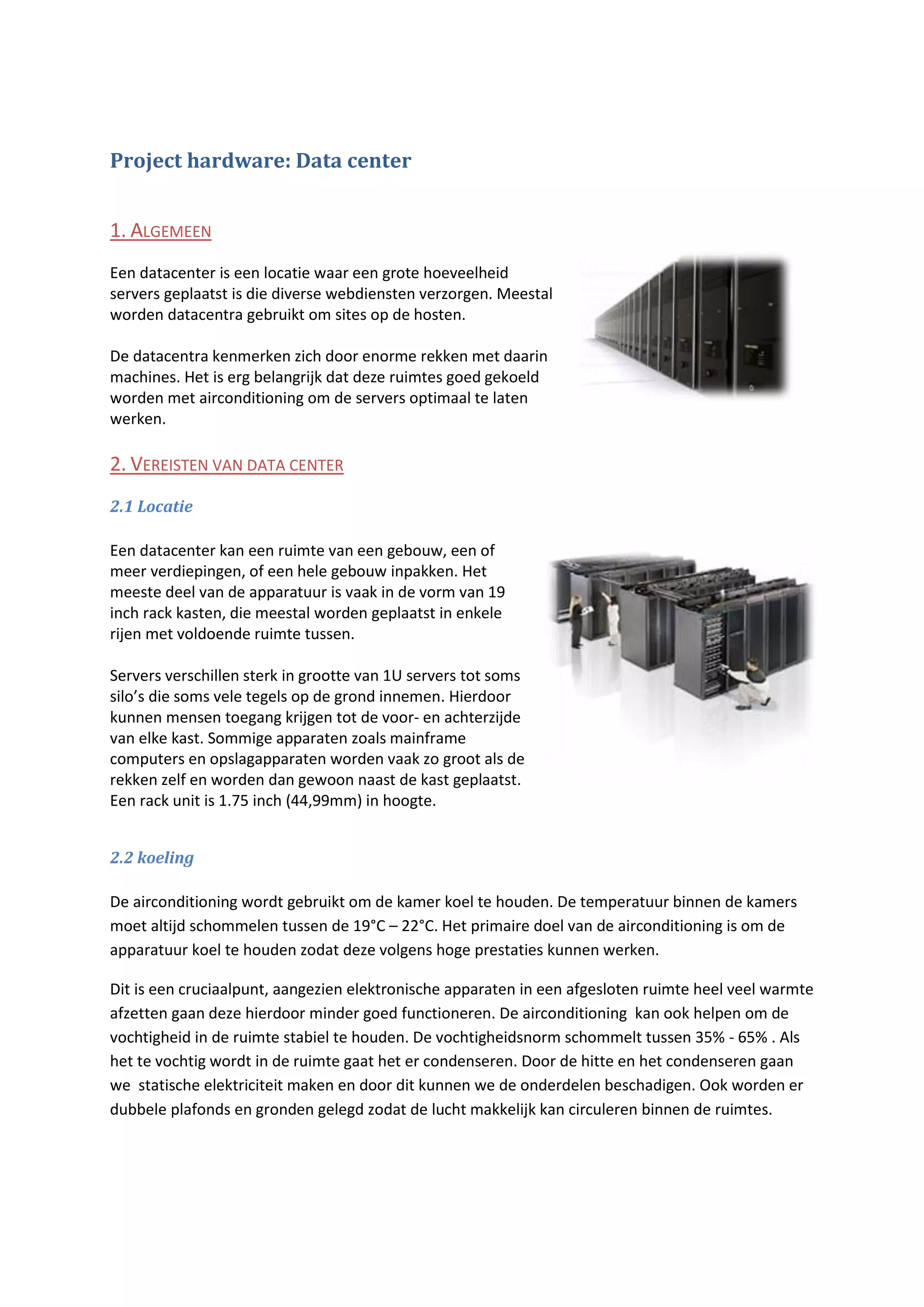 Project hardware: Datacenter<br />37674552844801. Algemeen<br />Een datacenter is een locatie waar een grote hoeveelheid servers geplaatst is die diverse webdiensten verzorgen. Meestal worden datacentra gebruikt om sites op de hosten.De datacentra kenmerken zich door enorme rekken met daarin machines. Het is erg belangrijk dat deze ruimtes goed gekoeld worden met airconditioning om de servers optimaal te laten werken.<br />2. Vereisten van data center<br />2.1 Locatie<br />354838074930Een datacenter kan een ruimte van een gebouw, een of meer verdiepingen, of een hele gebouw inpakken. Het meeste deel van de apparatuur is vaak in de vorm van 19 inch rack kasten, die meestal worden geplaatst in enkele rijen met voldoende ruimte tussen. <br />Servers verschillen sterk in grootte van 1U servers tot soms silo’s die soms vele tegels op de grond innemen. Hierdoor kunnen mensen toegang krijgen tot de voor- en achterzijde van elke kast. Sommige apparaten zoals mainframe computers en opslagapparaten worden vaak zo groot als de rekken zelf en worden dan gewoon naast de kast geplaatst. Een rack unit is 1.75 inch (44,99mm) in hoogte.<br />2.2 koeling<br />De airconditioning wordt gebruikt om de kamer koel te houden. De temperatuur binnen de kamers moet altijd schommelen tussen de 19°C – 22°C. Het primaire doel van de airconditioning is om de apparatuur koel te houden zodat deze volgens hoge prestaties kunnen werken. <br />Dit is een cruciaalpunt, aangezien elektronische apparaten in een afgesloten ruimte heel veel warmte afzetten gaan deze hierdoor minder goed functioneren. De airconditioning kan ook helpen om de vochtigheid in de ruimte stabiel te houden. De vochtigheidsnorm schommelt tussen 35% - 65% . Als het te vochtig wordt in de ruimte gaat het er condenseren. Door de hitte en het condenseren gaan we statische elektriciteit maken en door dit kunnen we de onderdelen beschadigen. Ook worden er dubbele plafonds en gronden gelegd zodat de lucht makkelijk kan circuleren binnen de ruimtes. <br />-147955252095<br />2.3 Beveiliging<br />3252470102870<br />De toegang tot een datacenter wordt door middel van een individueel programmeerbare Proximity <br />Access Card (PAC) geregeld. Ieder gebruik van PAC wordt centraal opgeslagen met een tijd- en <br />datumstempel. De PAC kan niet door iemand anders worden gebruikt, want wanneer PAC over de <br />reader wordt gehaald om toegang te verkrijgen, wordt een digitale foto van u op het beveiligingssysteem getoond. Deze worden dan vergeleken met het beeld van de CCTV camera ter plaatse. <br />Alleen wanneer beide beelden overeenkomen, wordt er toegang verleend. De CCTV camera’s staan 24 x 7 x 365 aan en worden nauwlettend bekeken door een surveillancedienst. De back-up tapes die iedere dag gemaakt worden van het systeem worden veilig opgeborgen in brandkasten voor de veiligheid. De back-ups worden gemaakt door een mindtime back-up.<br />De uitleg vind u op dit onderstaande schema.<br />2.3.1 Mindtime back up<br />3707130901702.3 Brandbeveiliging<br />36398201179195De muren worden met een vuur vertragende verf gespoten om zo als er vuur zou uitbreken dit proces af te remmen. Witte tegels worden gelegd op de dubbele vloer om statische elektriciteit tegen te gaan zodat er geen apparaten kunnen beschadigd worden. Er wordt gebruik gemaakt van Very Early Smoke Detection Alarm (VESDA) in het datacenter. Dit zijn bijzondere gevoelige rookdetectoren die zijn verbonden met het Building Management System (BMS). Dit BMS wordt nauwlettend in de gaten gehouden door het personeel in het datacenter. Hierdoor worden mogelijke branden uitzonderlijk vroeg gedetecteerd. Daarnaast heeft het datacenter een bijzonder geavanceerd watermist-systeem dat branden blust zonder de apparatuur te beschadigen.<br /> <br />2.3 Stroomvoorziening<br />Elk 19\"