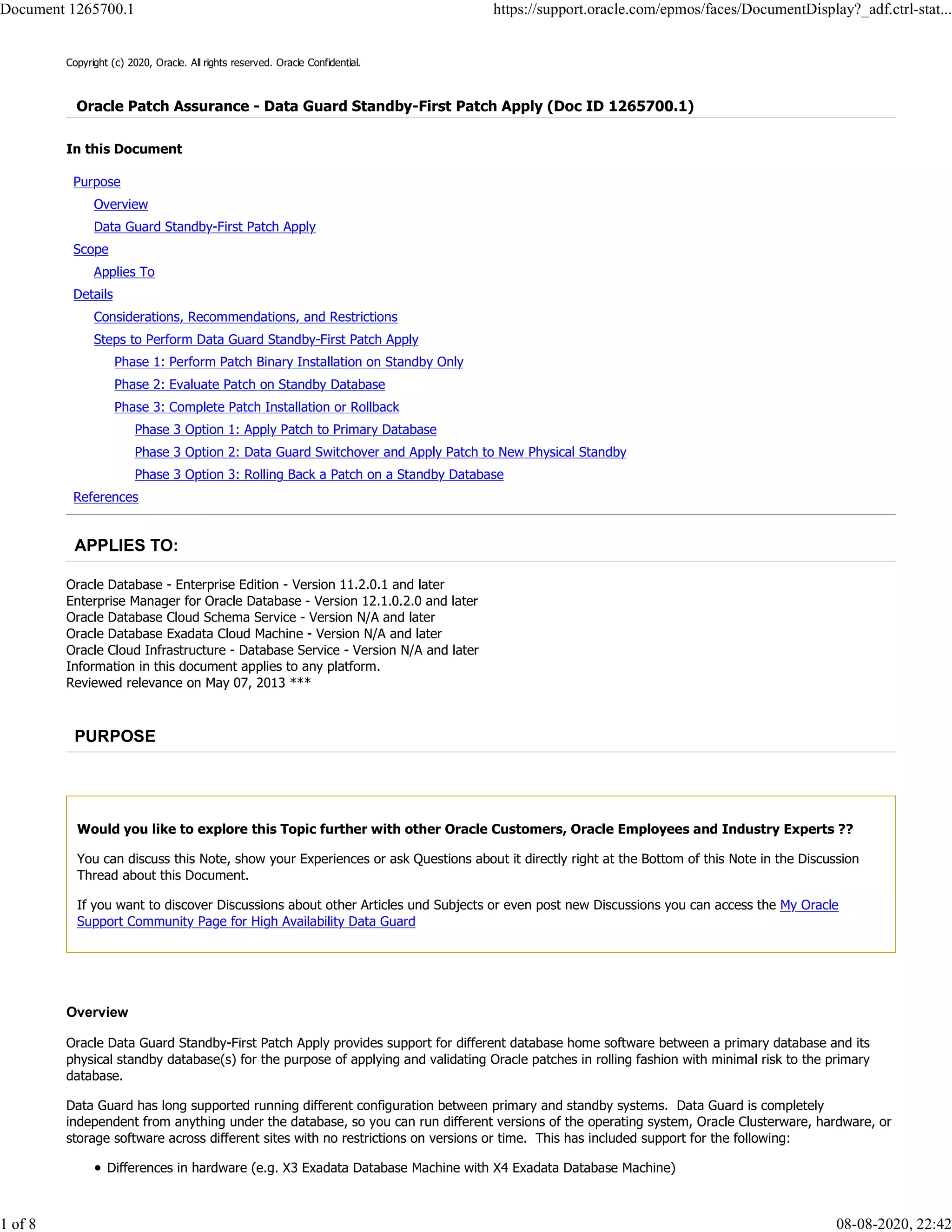 This document provides guidance on using Oracle Data Guard Standby-First Patch Apply to apply patches and patch bundles to physical standby databases before applying them to the primary database. It allows validating patches on the standby first with minimal risk to the primary. The process involves installing patches on the standby, evaluating them, then installing on the primary. It is supported for certified interim patches up to one year apart between primary and standby. SQL installation is delayed until all databases have the same binaries.