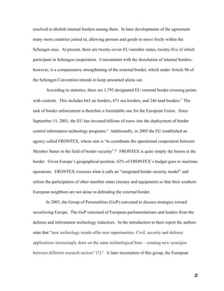 The document discusses border security technologies used in Europe, including the Schengen Information System (SIS) and Spain's SIVE border surveillance system. The SIS is a database containing information on persons banned from entering Europe or wanted for criminal offenses that is used at airports and for visa issuance. Spain uses the SIVE system of radar stations, control centers, and interceptor units to monitor its maritime borders and detect migrant vessels. The development of these technologies has made borders invisible and shifted surveillance to data collection and information sharing between countries.
