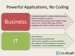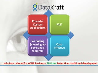 Datakraft offers powerful, no-code solutions that significantly accelerate application development, integrating with various systems and enabling custom applications. It provides features such as dashboards, project management tools, and document management, aimed at reducing manual tasks and improving efficiency. User testimonials highlight Datakraft's impact on streamlining processes and enhancing business operations.