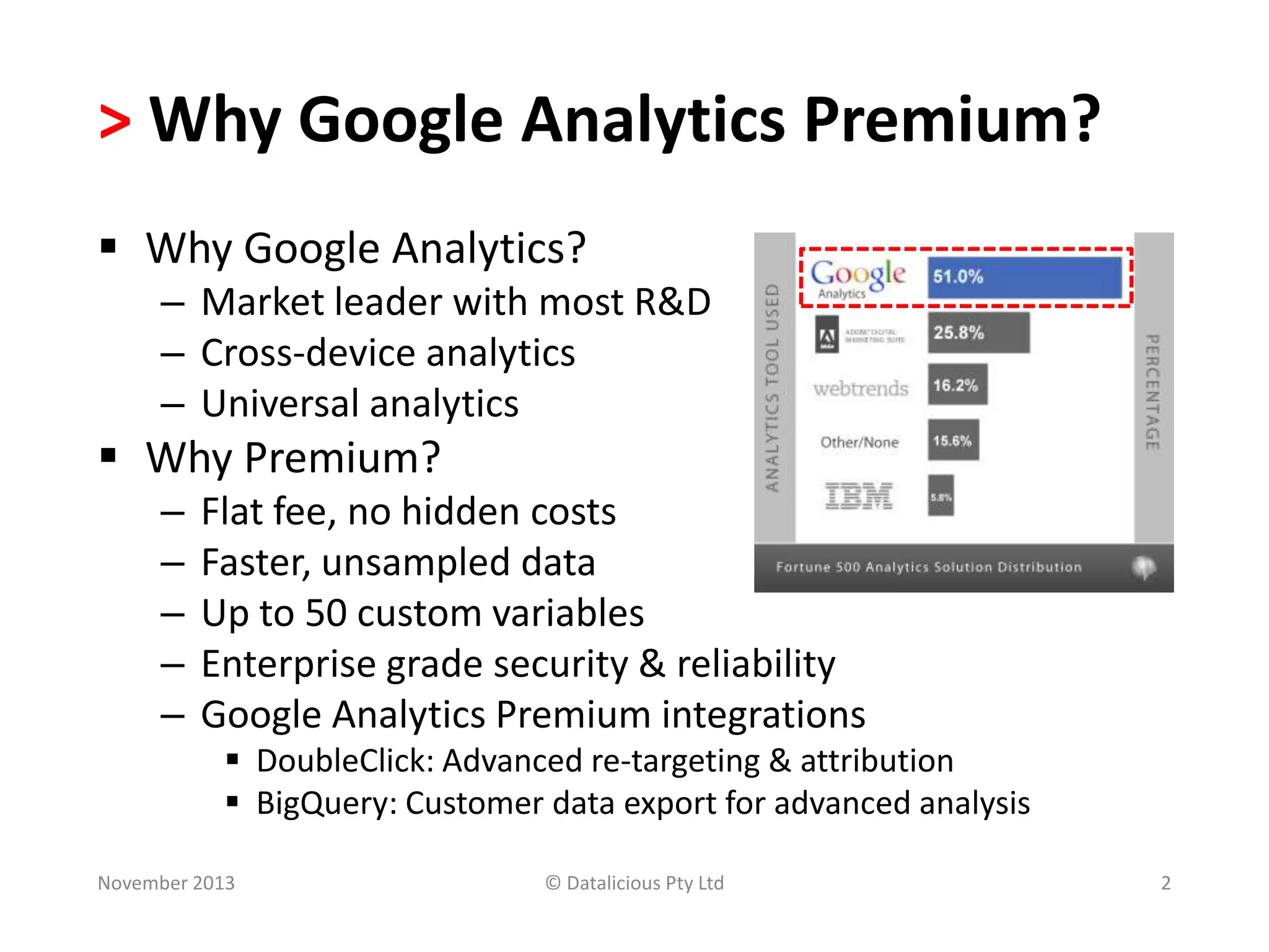 The document outlines the benefits of Google Analytics Premium, emphasizing its market leadership, enterprise-grade security, and faster access to unsampled data. Datalicious offers additional support packages at no cost, including technical assistance and quarterly reviews to enhance analytics and reporting. It highlights the importance of cross-device and cross-channel analytics for optimizing marketing strategies and improving ROI.