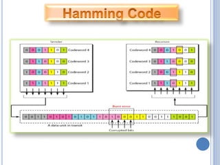 The document provides an overview of the data link layer. It discusses how the data link layer transforms the physical layer into a link responsible for node-to-node communication. Specific responsibilities include framing, addressing, flow control, error control, and media access control. It then describes various data link layer services, design issues, error detection and correction techniques like parity checks, cyclic redundancy checks, and flow control mechanisms.